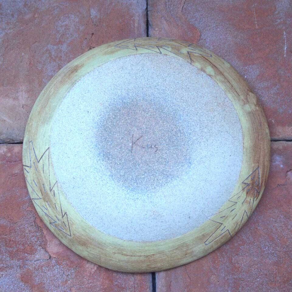 サイズ:直径25.5x高さ3 色:黄色x赤茶色・中央にトルコブルーのクロス。