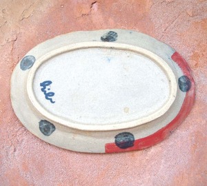 栢野紀文(陶) 楕円リム小皿(ベージュx赤)