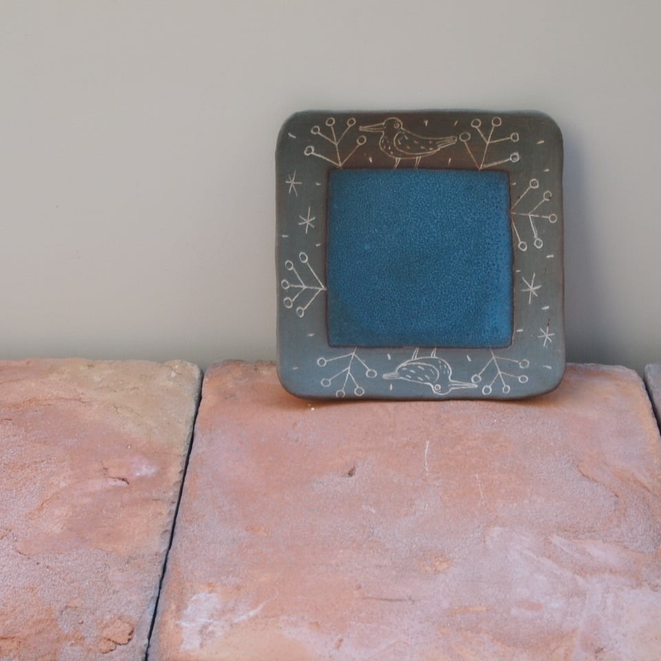 トルコブルーの釉薬が中央にほどこされています。トリや木の絵柄が白い線でほられています。周りのグレーの部分はマットな質感です。