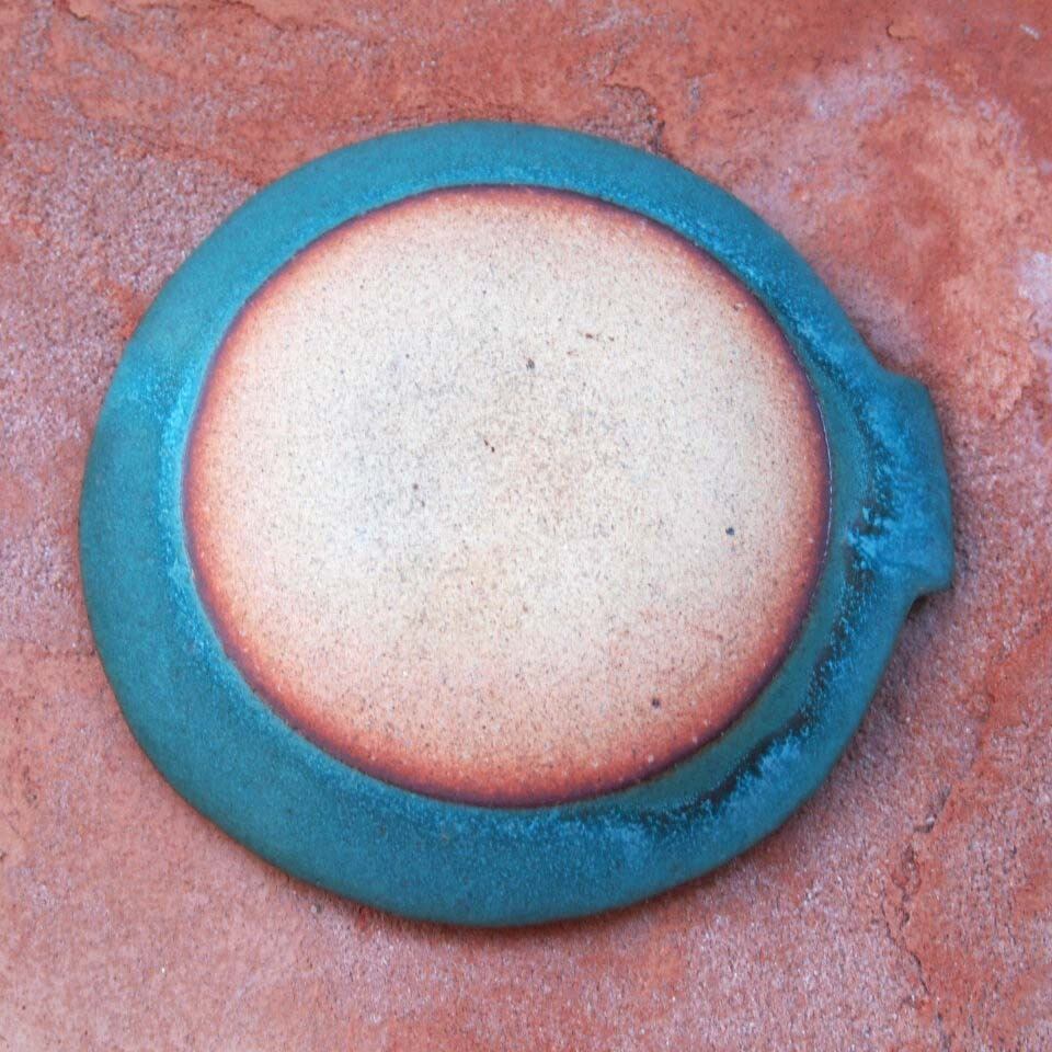 トルコ釉のブルーがかったグリーンの色と黒字に赤い線がはいっている、小皿です。赤い線がアクセントにもなっています。縁が傾斜しておりますので、つかいやすいです。