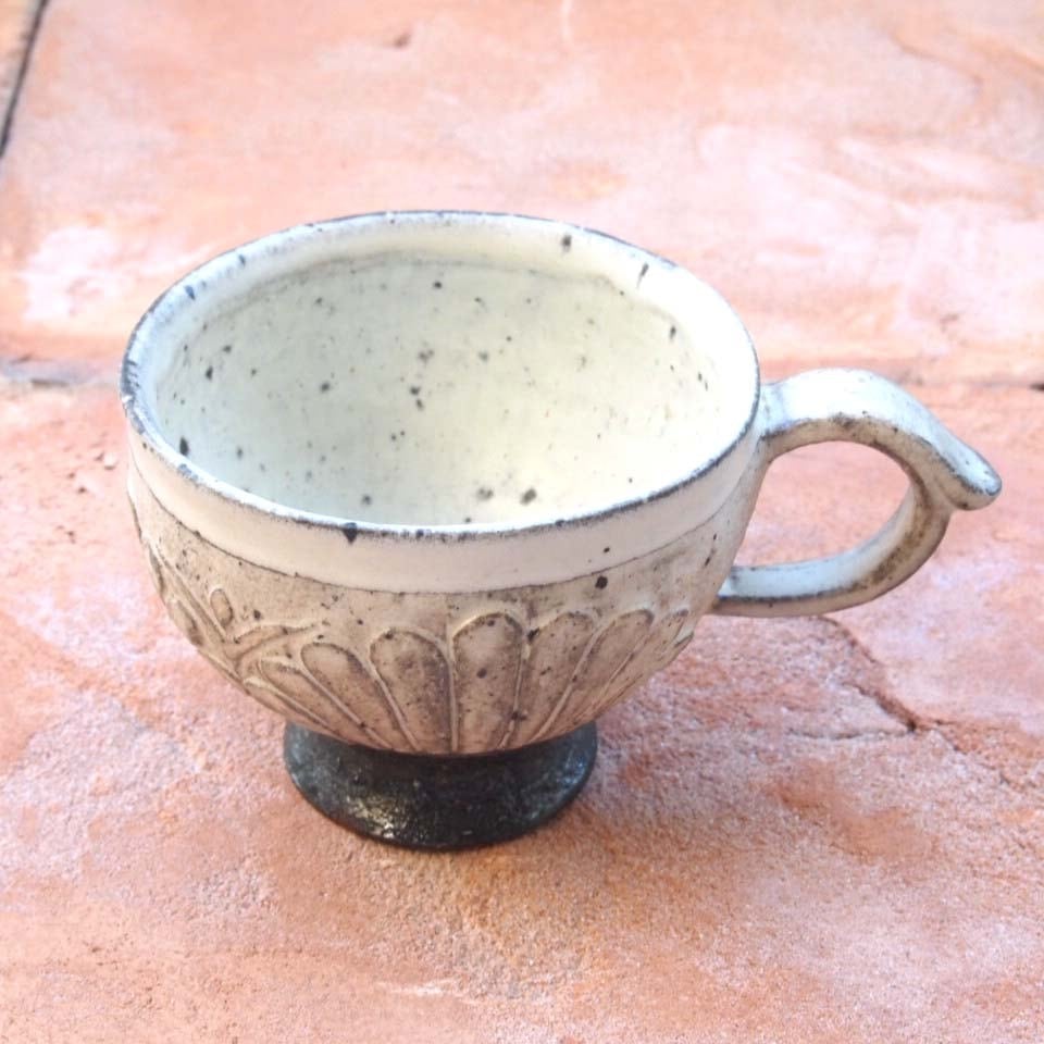 貝殻模様が削りだされています。白い化粧が施されています。丸みを帯びた形で、珈琲や紅茶、お飲物がたっぷりはいります。