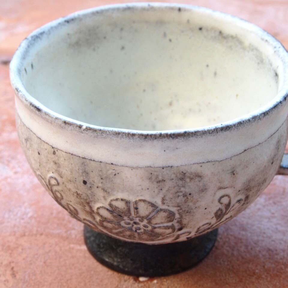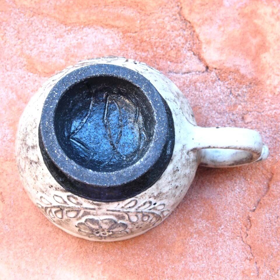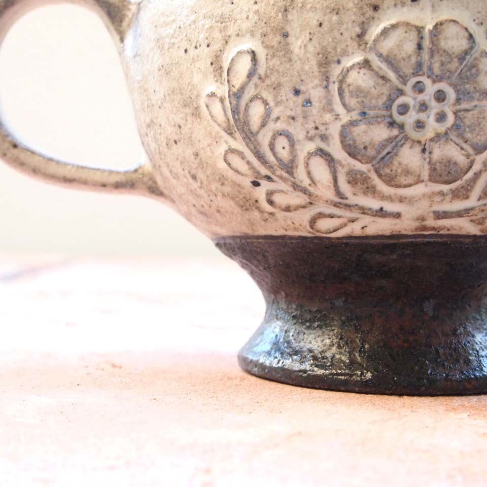 花柄模様が削りだされています。白い化粧が施されています。丸みを帯びた形で、珈琲や紅茶、お飲物がたっぷりはいります。