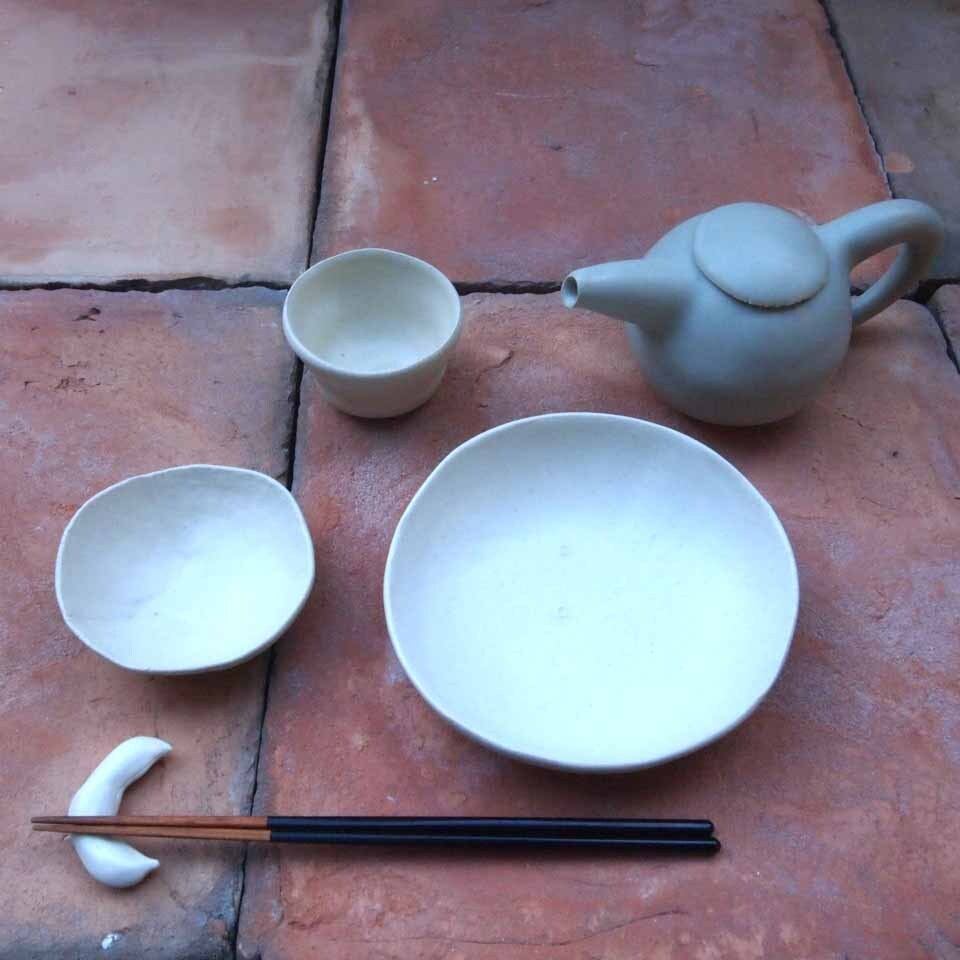 ココナッツ皿やポットやぐい吞みや、箸置き、とご一緒につかっていただいても、酒器と酒の肴のうつわとしてとても味わい深い作品です。