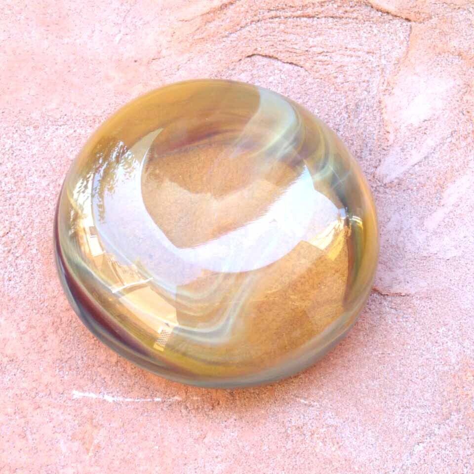 「玲瓏」シリーズは作家が「光り輝く模様のような玉」をイメージして、吹きガラスで、銀などを発色剤に数種類の鉱物などをあわせて反応させ制作されている作品です。その時々で発色の仕方が変わり、反応の出方も変わりすべて違ってくるそうです。