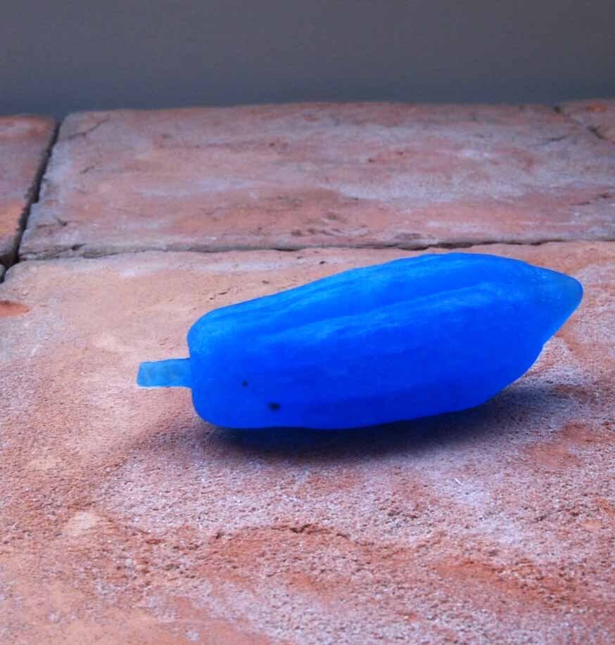 エキゾチックな美しいブルーです。窓辺など光を透かす場所に置くと、朝、昼、西日、夕方、、、、と時間による日差しの違いで、色が変化します。