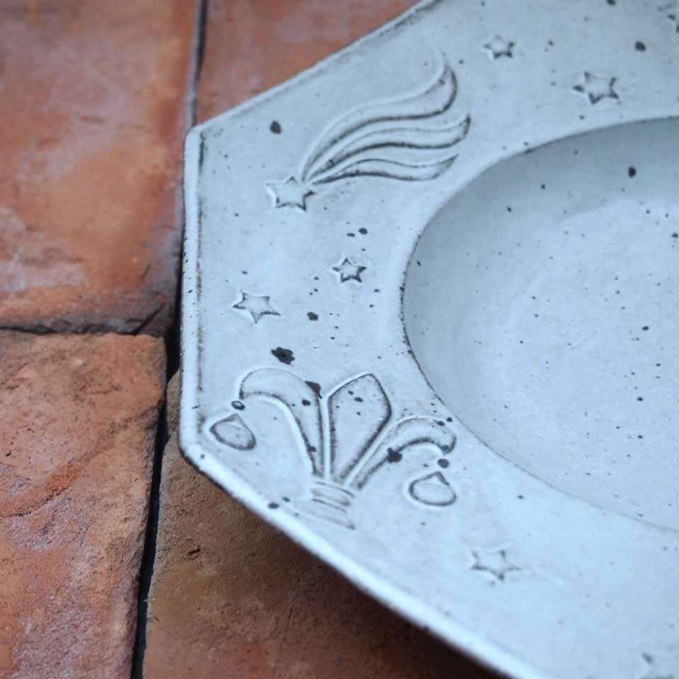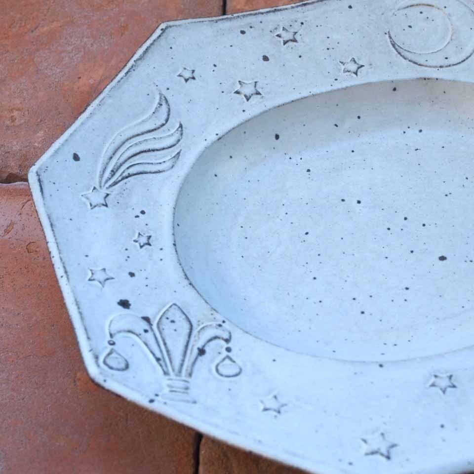 赤い土に白い化粧土を施してあり、模様が浮き上がっており、模様やお皿の角などから、あえて下地の黒い色が見え隠れし、古びたような雰囲気を醸し出しています。全体、少しつるっとした使いやすい質感に仕上がっています。星や月、などの模様がほどこされています。